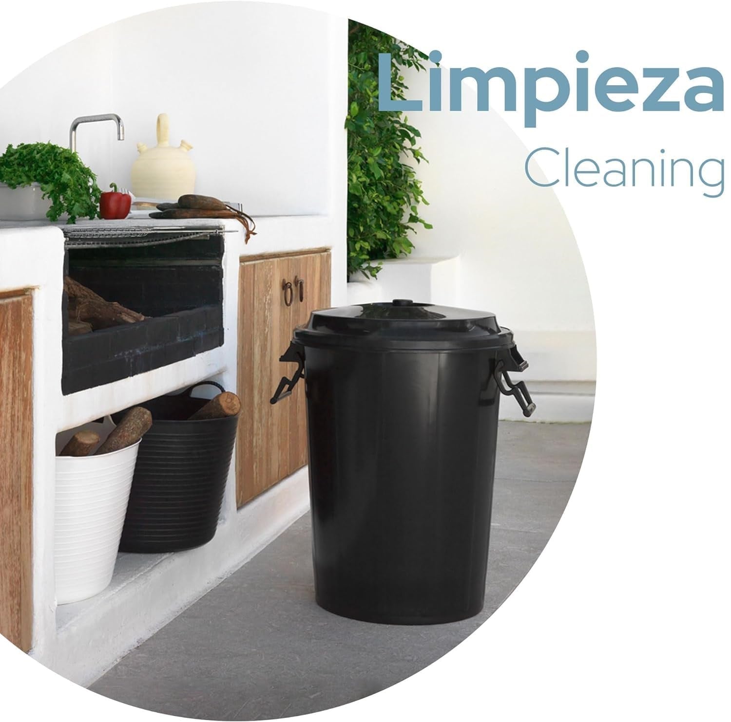 Cubo de basura con tapa y presillas para un mejor cierre. De gran capacidad y color negro.