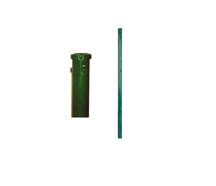 Poste para cierres redondo metálico, galvanizado y lacado en color verde, calibre: 48 mm con pestañas soldadas para alinear el alambre plastificado en verde,con tapa metálica para que no entre el agua o suciedad, disponible en 1,25 m. para malla de 1 m, en 1,45 m. para malla de 1,20 m. en 1,80 m. para malla de 1,50 m. en 2,40 m. para malla de 2 m.