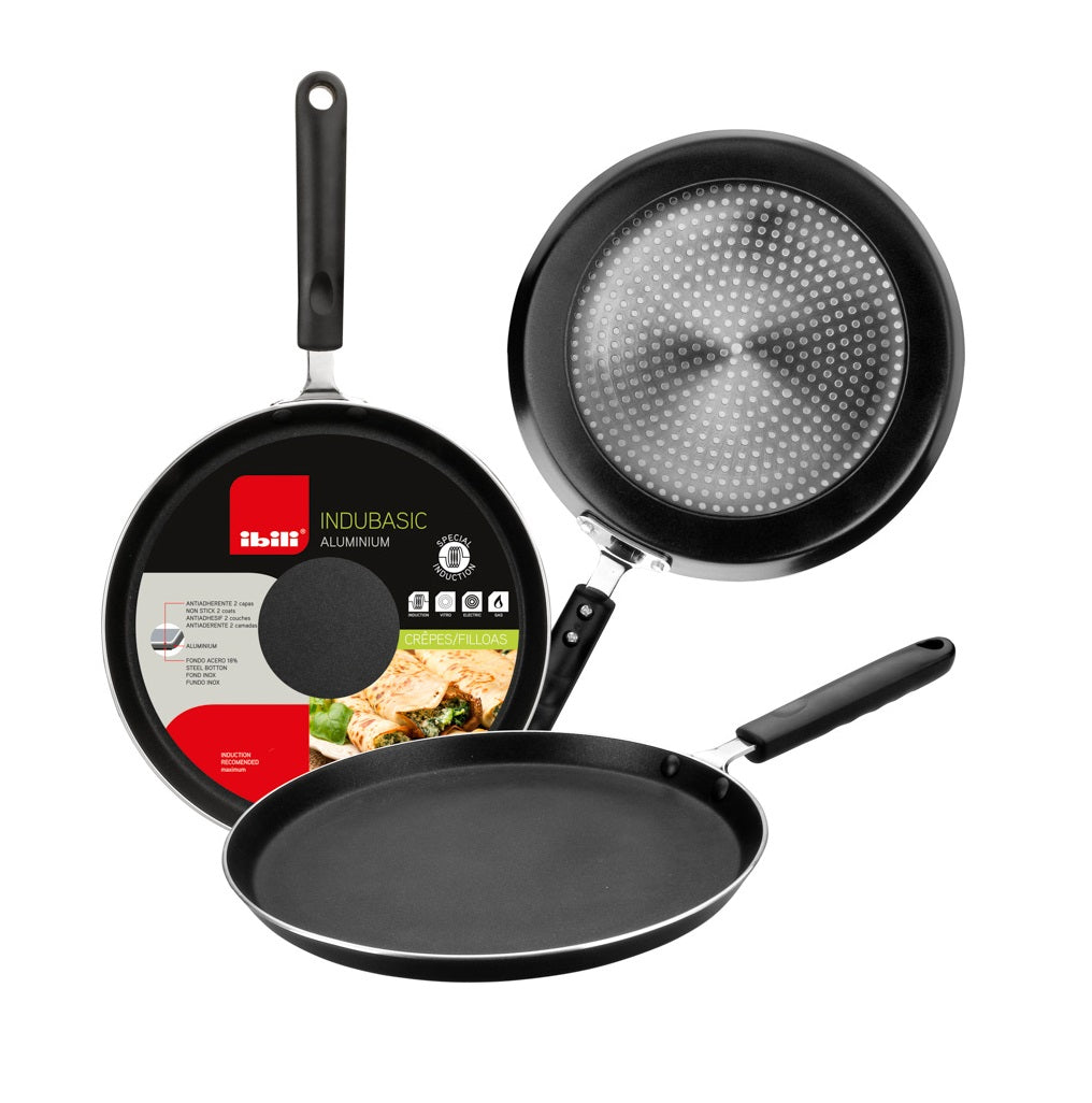La Sarten de Crepes Indubasic está fabricada en aluminio para inducción y mango de bakelita.