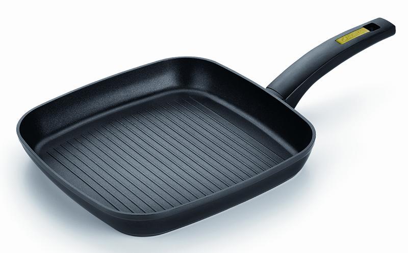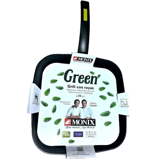Sartén-Grill marca Monix de aluminio fundido con recubrimiento antiadherente de alta resistencia, apta para todo tipo de cocinas incluído inducción, mango ergonómico de baquelita, medida de cocción: 28x28 cm. Fondo interior con rayas.